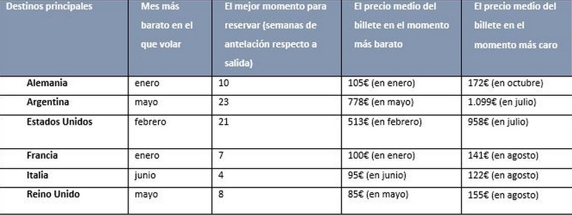Además, el comparador de precios ha analizado las diferencias en el precio del billete dependiendo del mes y el destino elegido. Alemania, Francia, Italia, Reino Unido, Estados Unidos y Argentina, han sido los países estudiados.