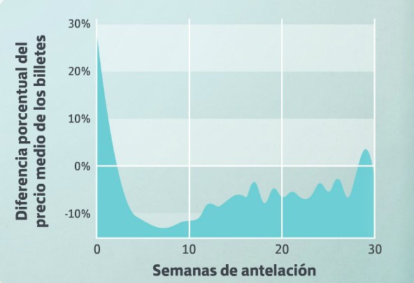 Según el informe, en nuestro país el mejor momento para reservar un vuelo suele ser 7 semanas antes de efectuar el viaje. Si se compra en esa fecha, los usuarios españoles podrán ahorrarse el 13,5% del precio medio del billete.
