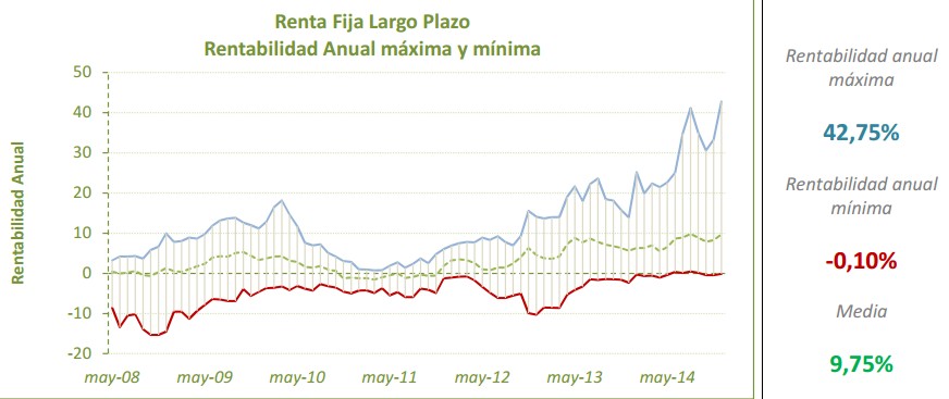 Ha habido un ligero aumento de la rentabilidad máxima anual pasando de 5,77% a 6,02%. La rentabilidad mínima sigue bajando y manteniéndose en negativo con un -2,61%. La diferencia porcentual entre la mejor y peor rentabilidad es de 8,63 puntos porcentuales.