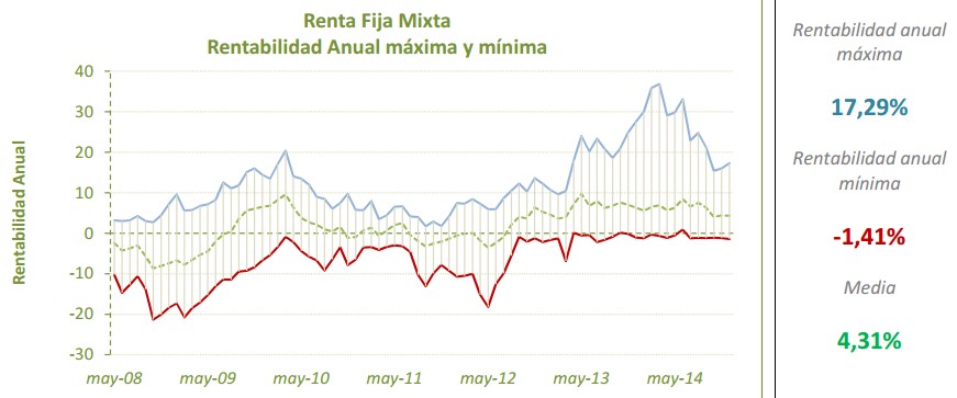 La rentabilidad media anual baja ligeramente del 4,42% a 4,31%. La rentabilidad máxima anual es de 17,29% y la mínima de -1,41%, por tanto una diferencia porcentual entre una y otra de 18,70 puntos porcentuales. Entran dos planes nuevos en esta categoría COLONYA SR y BBVA PLAN RF INTER.FLEXIBILIDAD de los cuales no hay datos.