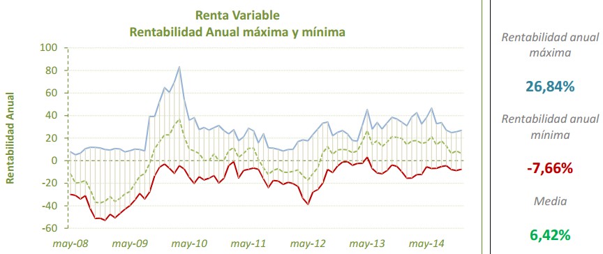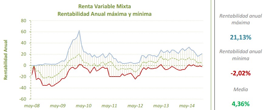En Renta Variable Mixta hay una pequeña bajada en la media de las rentabilidades anuales, pasando de 5,99% a 4,36%. La rentabilidad máxima ha sido 21,13% y la mínima sigue en negativo y bajando un poco más desde el -0,51% al -2,02%. Hay pues una diferencia entre la mejor y la peor de 23,15 puntos porcentuales.