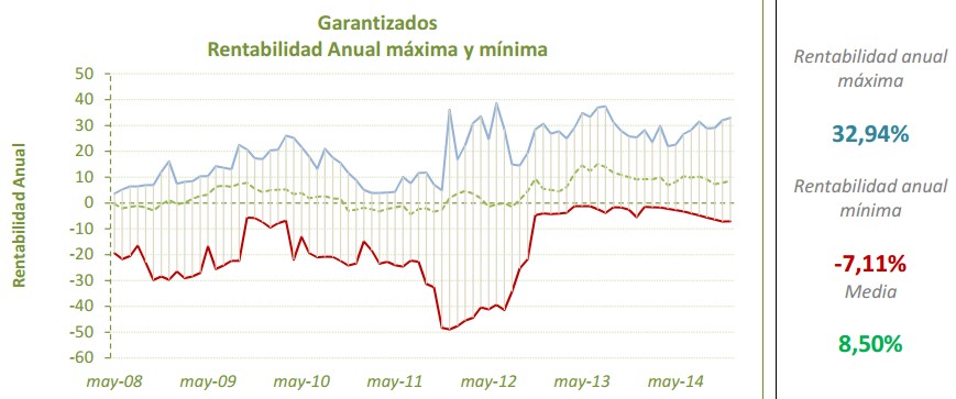 Ligera mejoría también en el rango de rentabilidades máxima de los planes garantizados en diciembre, con una subida desde el 32,02% al 32,94%. La mínima sigue manteniéndose en negativo con un -7,11%. La diferencia entre la mejor y la peor rentabilidad anual es de 40,05 puntos porcentuales.
