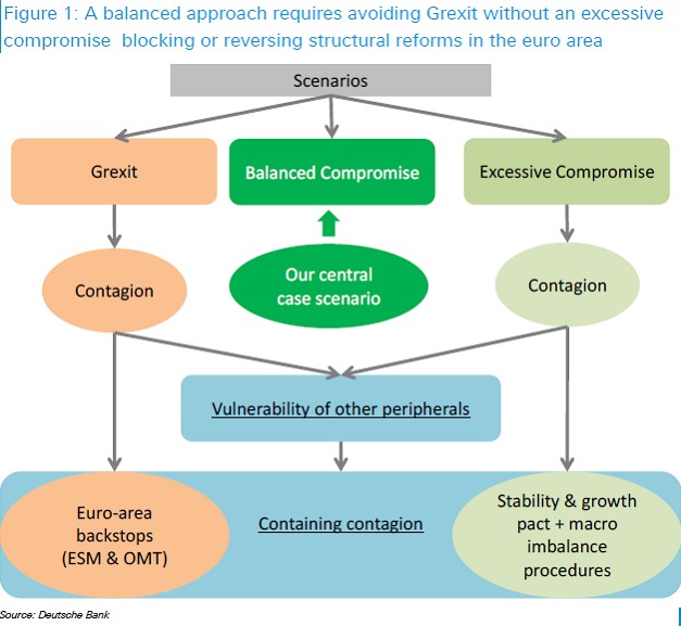 - Escenario base: Grecia y la troika alcanzan un nuevo compromiso, ambas partes ceden en algo y logran renovar el plan de rescate. No hay grandes repercusiones en la zona euro.