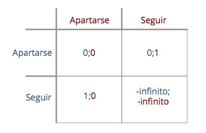 Los jugadores una vez entran en el juego tienen dos opciones. Apartarse o Seguir. Si el jugador rojo se aparta y el azul se aparta ambos pierden, hacen el ridículo y para eso mejor que no hubieran jugado. Si el jugador azul se aparta antes que el rojo, el primero pierde y queda como un gallina y el segundo gana, y viceversa […] El problema es que si ambos jugadores optan por la opción ganadora de seguir pase lo que pase, la convierten automáticamente en una opción perdedora, ya que acarrea la muerte o el desastre.