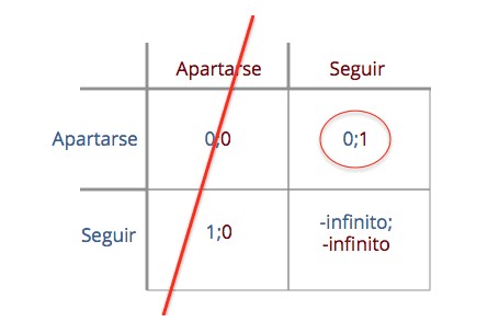 La única forma que tienes de ganar el juego es que el otro jugador se comporte de forma no racional y opte por perder y apartarse antes que tú. Para lograrlo tienes simplemente que eliminar la opción que tiene el otro jugador de ganar de la matriz de decisiones. Por ejemplo, arrancando el volante del coche y arrojándolo ostensiblemente por la ventana […] Al arrancar el volante estás eliminando de la matriz de decisiones la columna que permitía al otro jugador tomar la decisión racional de seguir para ganar el juego. Ahora ya no tiene la posibilidad de ganar, sólo puede o quedar como gallina o morir por lo que su decisión más racional será abandonar.