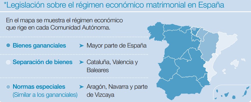 En Cataluña, Valencia o Islas Baleares rige el régimen de separación de bienes. Por el contrario, si usted no pertenece a ninguna de estas comunidades y no pacta otra cosa ante notario antes de casarse, su matrimonio se regirá por el régimen de gananciales (o el sistema aragonés, navarro o vizcaíno, muy parecidos).
