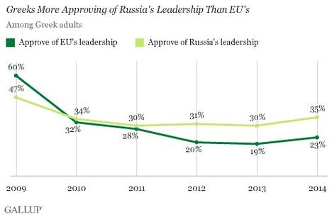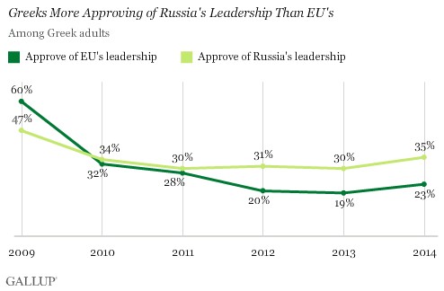Corría el año 2010 cuando Gallup publicó una encuesta en la que el 34% de los griegos se mostraba favorable ante el liderazgo político-económico de Rusia. El desapego hacia la Unión Europea ya era evidente por aquel entonces, pues la valoración positiva de Bruselas se quedaba por debajo de Moscú, en niveles del 32%.