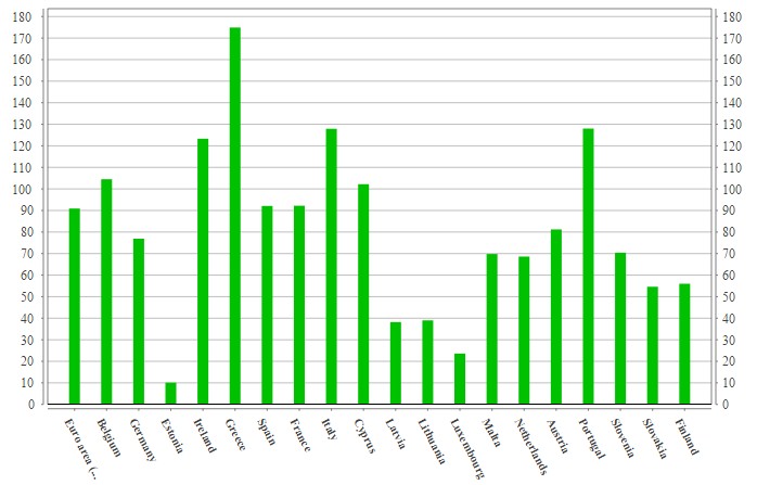 Los griegos soportan el mayor nivel de deuda pública de la zona euro y de la UE, con un 175% del PIB en 2013 (320.000 millones de euros), debido al excesivo gasto en el que incurrió la Administración helena durante la época de la burbuja crediticia.