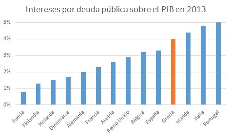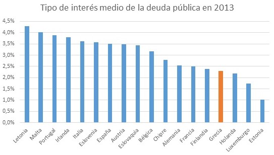 En este sentido, el caso de Grecia es paradigmático, ya que su deuda soportar uno de los tipos de interés medio más bajos de toda Europa, inferior al 2,5% en 2013, a pesar de que el volumen adeudado es ingente.