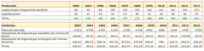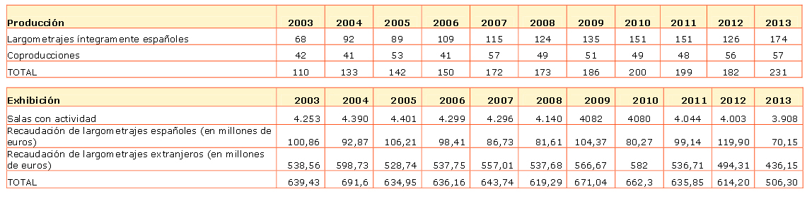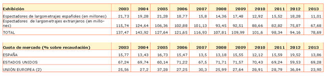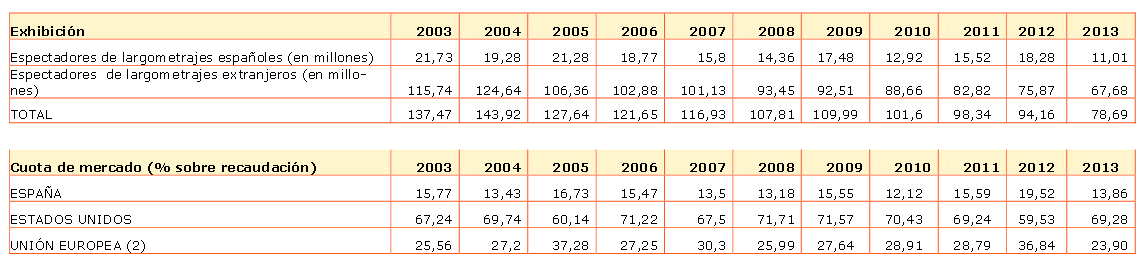 El mercado cinematográfico en España, en su conjunto cerró 2014 con un total de 522 millones de euros y 87 millones de espectadores. Las producciones españolas recaudaron 129 millones de euros y fueron vistas por 21,7 millones de espectadores el pasado año, con una cuota de mercado de casi el 26 por ciento (a continuación, los datos hasta 2013, último ejercicio con cifras oficiales).