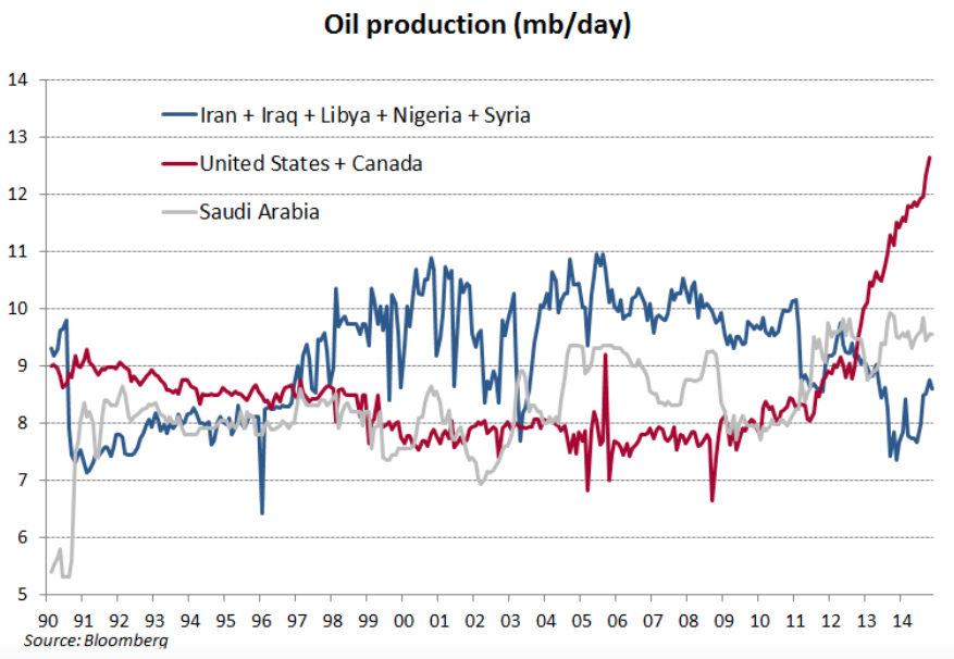 Este salto se explica por la revolución del "fracking", que ha disparado la producción de EEUU y Canadá de ocho a trece millones de barriles diarios: