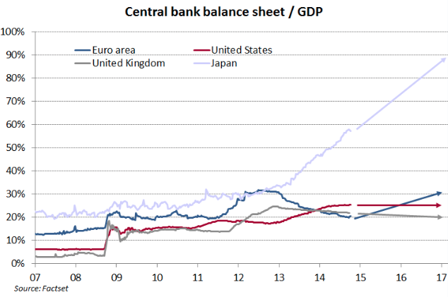 Por su parte, se espera que el BCE vuelva a expandir su balance, acompañando así las medidas de expansión cuantitativa y recuperando las cotas alcanzadas en los últimos años de Jean Claude Trichet. Sin embargo, Lazard separa el experimento europeo de la política monetaria japonesa, cuya agresividad es mucho mayor, tal y como se muestra en la siguiente gráfica: