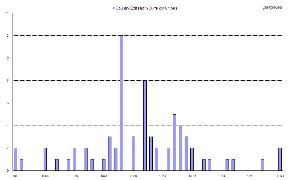 La salida de Grecia del euro no sería algo excepcional. Los casos de ruptura monetaria han sido frecuentes a lo largo de la historia. Y no hace tanto tiempo. Basta retroceder medio siglo para contabilizar decenas de desintegraciones monetarias, tal y como recoge el blog de Perpe.