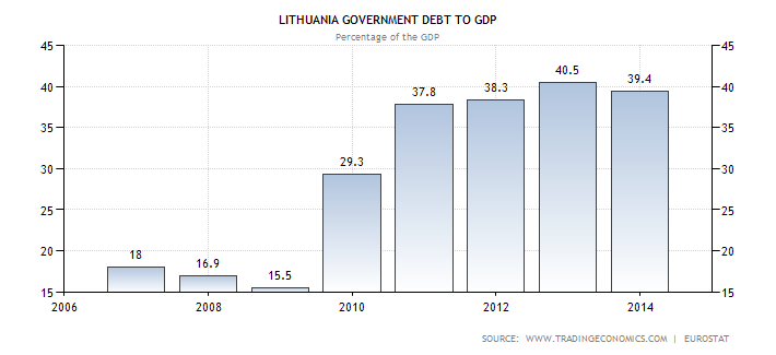 Los datos de Lituania no son tan positivos en el ámbito del endeudamiento de las Administraciones. En 2009, estas obligaciones se limitaban al 15,5% del PIB, mientras que en 2010 se habían multiplicado por dos, alcanzando el 29,3%. La tendencia alcista siguió en 2011, 2012 y 2013, tocando techo en el 40,5% del PIB.