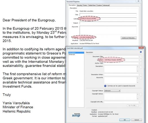 Varios periodistas han apuntado que, mientras Europa dormía, la troika revisaba la lista de reformas enviada por Grecia. El primer informador que apuntó esta posibilidad fue el griego Yannis Koutsomitis. El periodista de la BBC comprobó que el archivo PDF que recogía el listado de reformas remitido por Atenas tenía como autor a Declan Costello, un alto cargo de la Comisión Europea.