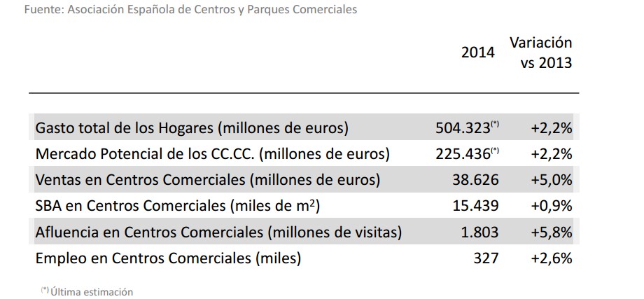 Otro indicador que aumento en 2014 fue la afluencia de clientes, que ha sido de 1.803 millones de visitas, un 5,8% más. En términos de empleo, el sector ha incrementado la creación de empleo un 2,6% respecto al año anterior y actualmente, ya trabajan en sus recintos 327.000 personas.