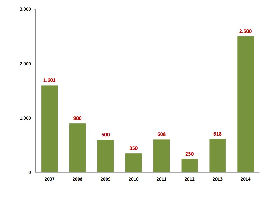 Y es que la inversión por transacciones en centros comerciales alcanzó el pasado año los 2.500 millones de euros en 2014, cuadriplicando el importe de las operaciones realizadas en 2013, que sumaron 618 millones de euros. Como se observa en la gráfica siguiente, la inversión en este sector el año pasado ha supuesto la mayor desde el inicio de la crisis.