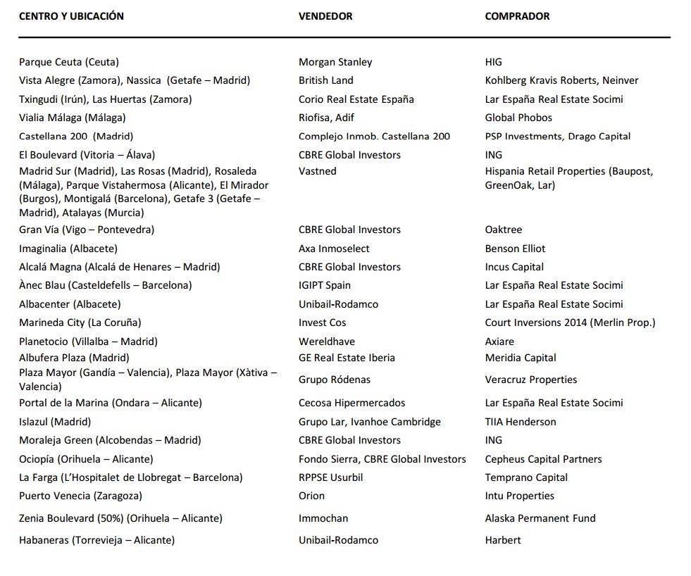 La mayor operación del año fue la venta de Puerto Venecia (Zaragoza), el centro comercial más grande del país. El grupo inmobiliario británico Intu alcanzó un acuerdo con el fondo europeo Orion para comprar el centro comercial por 451 millones de euros. La extensión total de este centro es de 212.600 metros cuadrados que albergan hasta un lago y un miniparque de atracciones.
