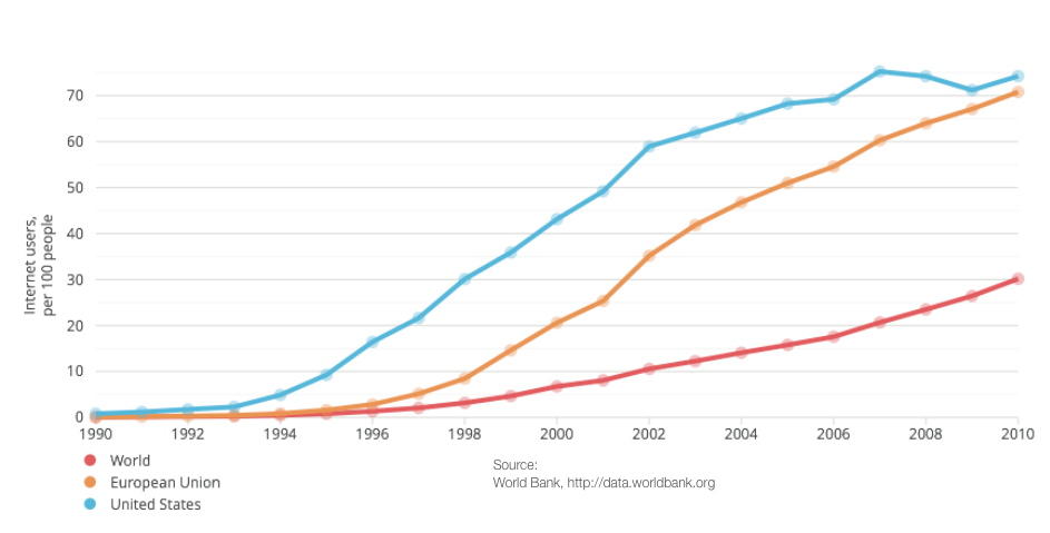 Esta revolución quedaría incompleta si no fuese de la mano de un aumento del uso de la tecnología. Como vemos en la gráfica que sigue, la tasa global de acceso regular a internet ha llegado ya al 30%, mientras que en EEUU y la Unión Europea alcanza el 70%.