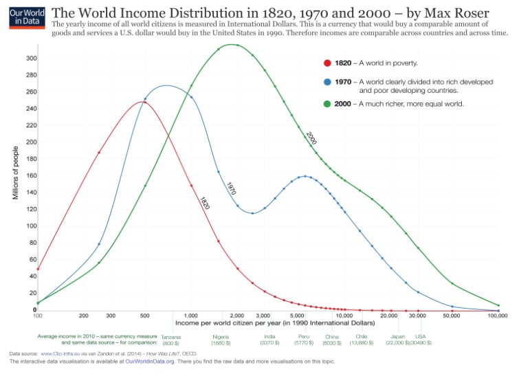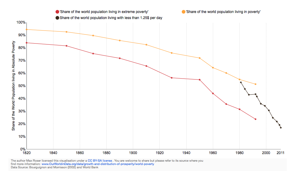 A nivel mundial, el alcance de la pobreza ha pasado de los niveles del 80-90% que se registraban en 1820 a las tasas inferiores al 20% en las que nos movemos en la actualidad, de acuerdo con los estudios del Banco Mundial y de los economistas Bourguingnon y Morrison.