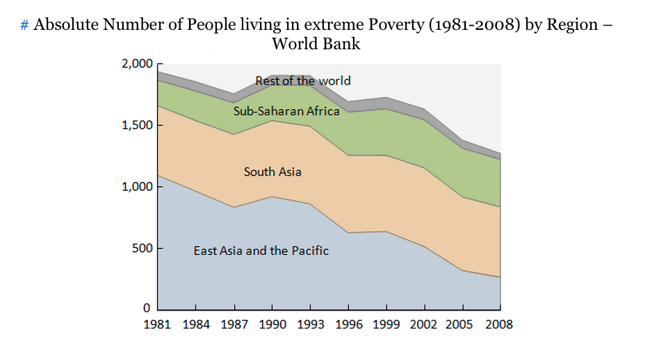Región por región vemos que este descenso es generalizado: aunque vayamos a los continentes más afectados por la miseria, caso de África o Asia, el rumbo de las últimas tres décadas arroja una evolución francamente positiva. Así lo muestran los datos del Banco Mundial: