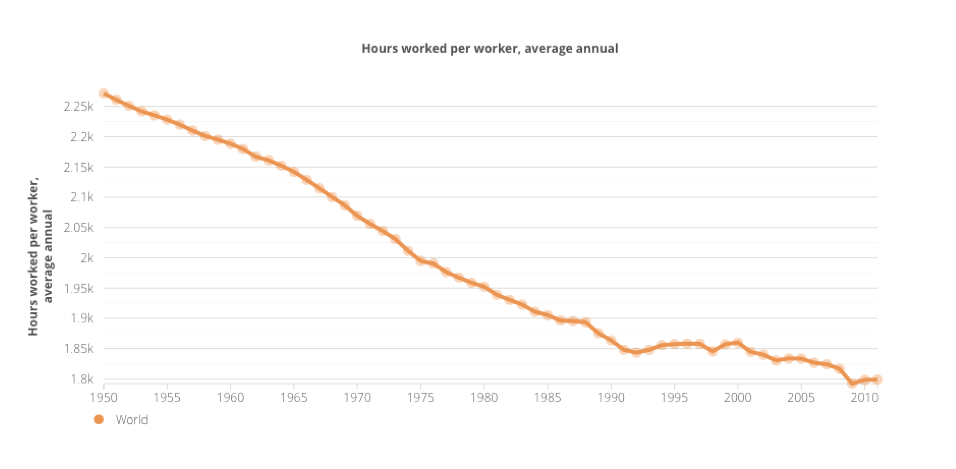 Estos avances socioeconómicos permiten que el número de horas trabajadas vaya a menos. Como vemos, en los años 50 el empleado medio pasaba 2.250 horas al año en su puesto de trabajo; la media global actual ronda las 1.800 horas. Lo vemos en la gráfica que sigue, elaborada con datos de la OMT: