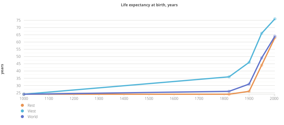 Esto permite que la esperanza de vida haya aumentado de forma significativa. La gráfica siguiente muestra su evolución entre los años 1000 y 2000: en azul oscuro vemos la media global, en azul claro la de las economías de la OCDE y en naranja la del resto de países del mundo. Los datos forman parte del libro "Poverty and progress", de Deepak Lal: