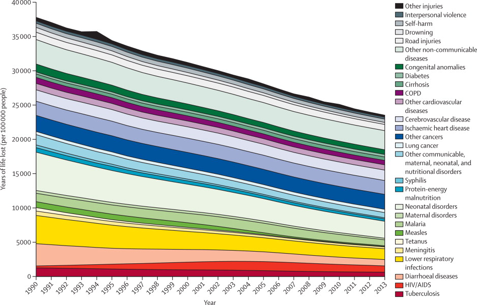 También las enfermedades tienen una incidencia mortal cada vez más baja. La revista médica The Lancet ha medido el número de años perdidos anualmente debido a la mortalidad derivada de afecciones tan dispares como la malaria, la tuberculosis, el sida o las enfermedades del corazón. A pesar del crecimiento de la población mundial, la cifra total ha caído de 37.500 a 26.000 entre 1990 y 2013: