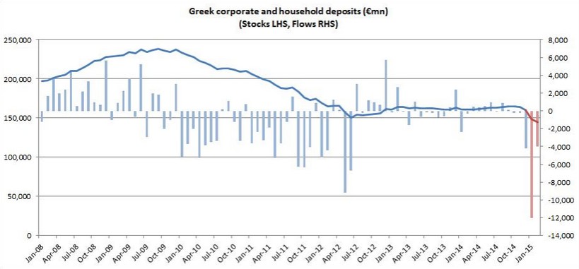 Las semanas previas a la elección de Alexis Tsipras como primer ministro de Grecia se materializaron en una retirada masiva de depósitos, reflejando así el pánico de los ahorradores a la quiebra y posterior salida del euro del país tras la victoria de Syriza.