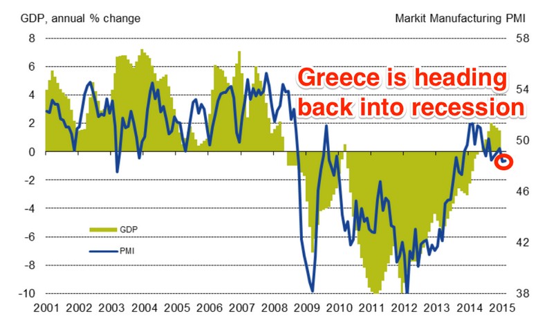 Tras registrar varios trimestres consecutivos de crecimiento, el PIB heleno bajó un 0,2% en los últimos tres meses del año, coincidiendo con la convocatoria de elecciones generales anticipadas en un momento en el que la coalición de izquierda radical encabezaba todas las encuestas. El problema, sin embargo, es que todo apunta a que este deterioro ha continuado en el inicio de 2015.