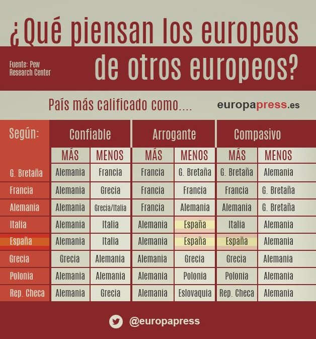 ¿Qué país es más arrogante, al menos según los ojos de los ciudadanos de la Unión Europea? ¿Y en el que más se puede confiar? Esta y otras preguntas las ha tratado de responder una encuesta elaborada por Pew Research Center que ha observado qué opinan unos sobre otros y cómo los estereotipos son constantes en las relaciones entre europeos.
