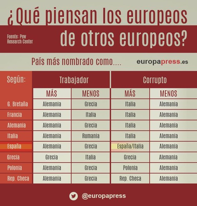 Estos resultados tienen mucha relación con otra encuesta sobre estereotipos del año anterior. En ella, se preguntó a los europeos en qué país los ciudadanos eran más trabajadores, y dónde se encontraba mayor corrupción.