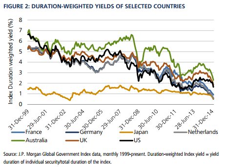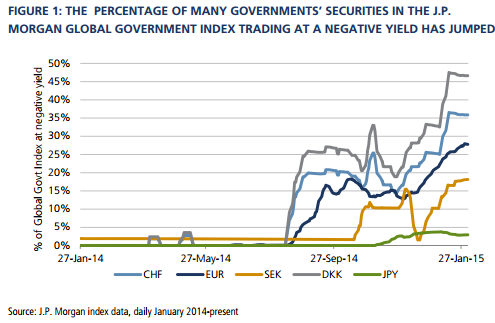 De acuerdo con un informe que JP Morgan ha dedicado a esta cuestión, cerca del 30% de la deuda emitida por los países de la Eurozona está registrando rentabilidades negativas. La cifra es aún mayor en el caso de Suiza (35%) o Dinamarca (40%). Algo más bajo es el porcentaje registrado en Suecia (18%), mientras que en Japón la cifra es mucho más modesta (3%).