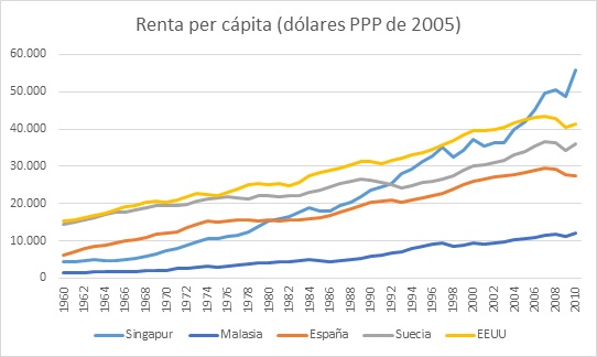 Miren el siguiente gráfico: refleja un país abandonando el Tercer Mundo y convirtiéndose en una de las zonas más ricas del planeta; refleja el impresionante éxito económico de Singapur, cuya renta per cápita en dólares internacionales ya supera a la de EEUU o Suecia, duplica la de España y quintuplica la de su vecina Malasia.