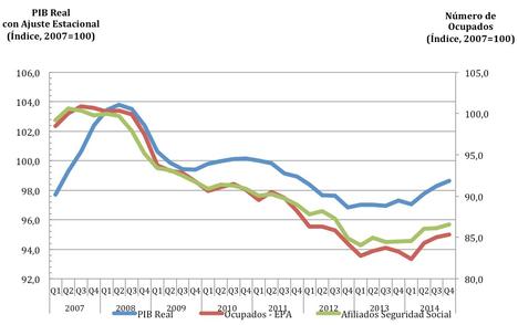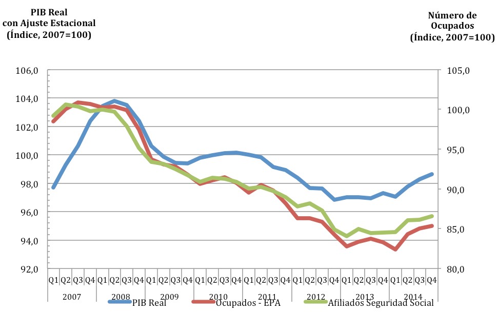 "Esto quiere decir que si mantenemos el ritmo de crecimiento del PIB observado en el ultimo trimestre de 2014 (0,7 intertrimestral) y la creación de empleo a lo largo de 2014 según afiliados (417.000 afiliados netos) o EPA (433.000 empleos netos) no alcanzaremos el nivel de PIB real de antes de la crisis hasta el año 2017 y el nivel de empleo hasta 2021 si hablamos de afiliados (2022 si hablamos de la EPA). Es decir, hay que esperar dos años para ser capaces de producir lo mismo que antes de la crisis, y seis o siete años para recuperar el mismo nivel de empleo", advierten los expertos.