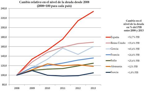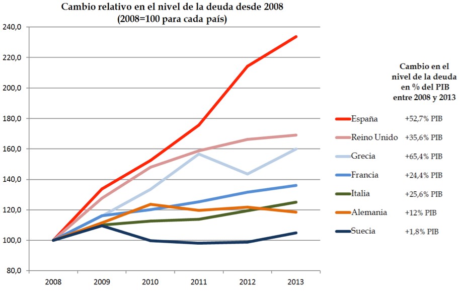 Como consecuencia de este alto y continuado desequilibrio fiscal, España "también es de los países que más ha incrementado su deuda pública durante la crisis. En concreto, la deuda pública ha subido en 52,7 puntos de PIB, es decir se ha multiplicado por más de 2,3 veces". España tiene por delante el mayor ajuste fiscal del mundo para garantizar la sostenibilidad de la deuda a medio y largo plazo.