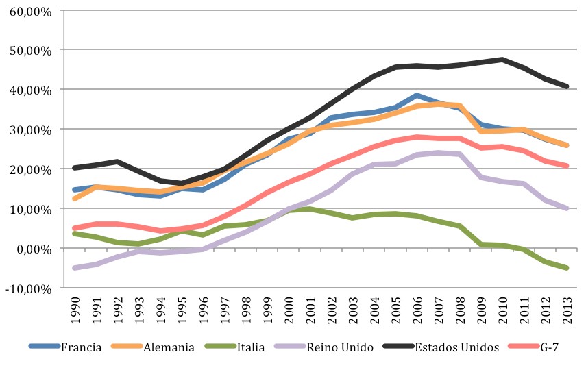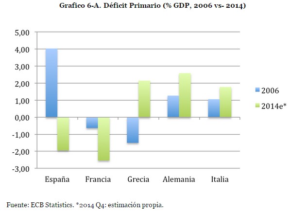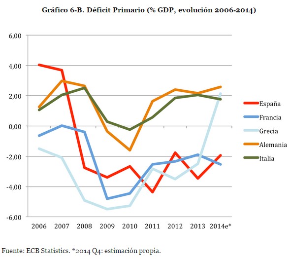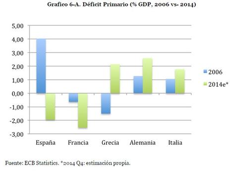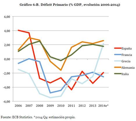 Y lo más grave es que, además, es de los países de la UE con un mayor déficit primario (descontando el pago de intereses). "Dicho de otra forma, la prueba palpable de que la crisis fiscal aun no está resuelta es que, tras más de seis años consolidación fiscal, España aún presenta un déficit primario del entorno del 2% mientras que Italia o Grecia presentan superávits", según los datos de cierre de 2014, enfatizan ambos economistas.