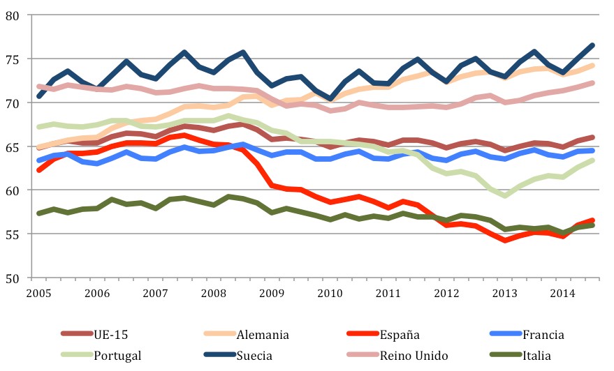 Uno de los grandes problemas estructurales cuya solución se antoja muy lejana es la baja tasa de empleo que, históricamente, presenta el país, sobre todo ahora, tras el impacto de la crisis. El nivel de ocupación entre la población activa es uno de los más bajos del mundo desarrollado, apenas superior al 55% frente al 66% de la media de la UE-15.