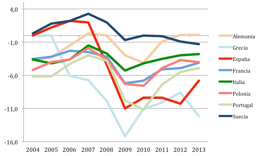 En materia de cuentas públicas, el desajuste es más que evidente. A pesar de que el Gobierno del PP insiste en que la consolidación fiscal avanza a buen ritmo, lo cierto es que el déficit continúa registrando tasas históricamente altas. España es uno de los países que ha presentado un mayor déficit público durante la crisis...