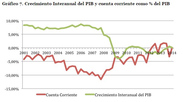 Otro dato muy preocupante es el desequilibrio exterior. "Es indudable que el sector exterior nos ha dado noticias positivas durante la crisis […], pero sigue siendo un problema sin resolver. Tal como se puede ver en el siguiente gráfico, y a pesar de la tregua que nos están dando los bajos tipos de interés y el precio del petróleo, el déficit por cuenta corriente aumenta tan pronto como crecemos".
