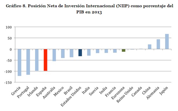 Y el principal inconveniente de crecer a base de aumentar el déficit por cuenta corriente es que el país necesita del ahorro exterior, "y esto es un problema si tienes un endeudamiento neto con el exterior (Posición de Inversión Internacional Neta) que roza el 100% del PIB [...] España es conjuntamente con los países intervenidos (Grecia o Portugal) de los países con una mayor deuda exterior neta", aclaran Conde-Ruiz y Marra.