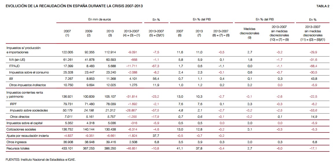 Sin embargo, debe tenerse en cuenta que durante este período las subidas de impuestos "generaron un incremento de la recaudación estimado en alrededor 2,7 puntos de PIB. Si se elimina el impacto de estos incrementos impositivos de la recaudación observada en 2013, la reducción de ingresos impositivos en el período 2007- 2013 alcanzaría el 17%, equivalente a 6 puntos porcentuales de PIB (unos 60.000 millones de euros).