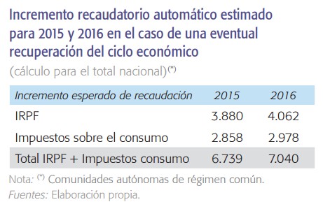 En concreto, dicho organismo señala que cabe esperar un repunte automático en la recaudación conjunta de IRPF e impuestos sobre el consumo de 6.700 y 7.000 millones de euros en 2015 y 2016, respectivamente. Y ello, siempre y cuando se cumpla el crecimiento de la renta nominal disponible de los hogares del 3,3% y 3,5% que prevé Funcas para los citados ejercicios.