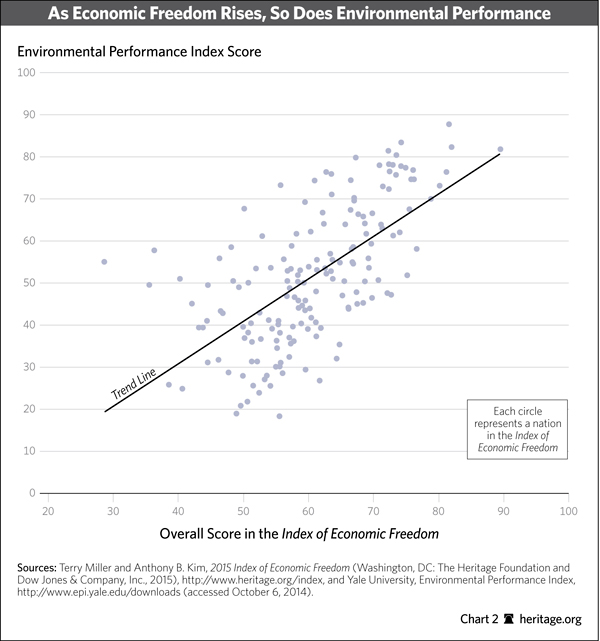 El vínculo entre capitalismo y conservación del medio ambiente queda reforzado cuando trazamos la correlación entre el Índice de Desempeño Medioambiental y el ranking de Libertad Económica que publican cada año el Wall Street Journal y la Fundación Heritage.