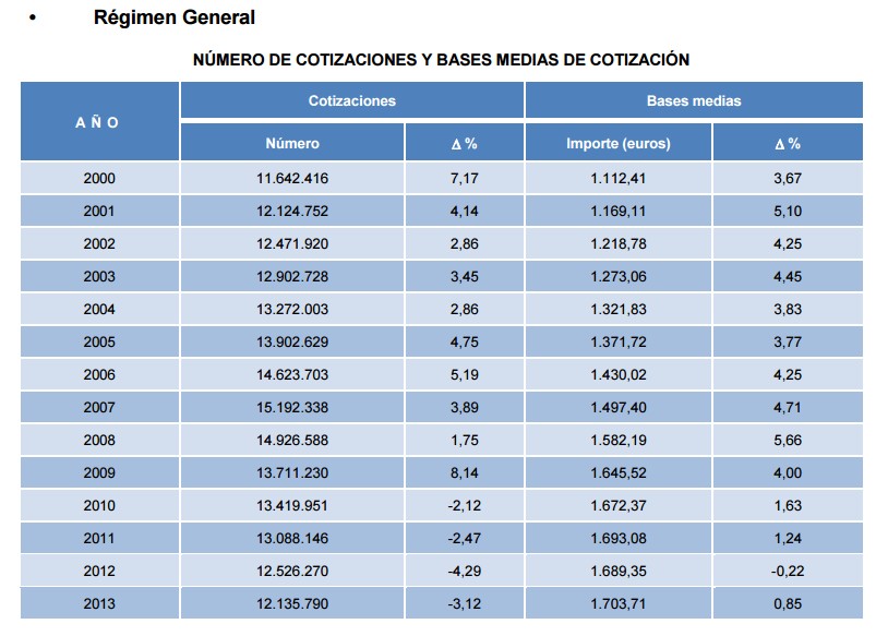 Pero además, es imprescindible que sea esos nuevos empleos sean de esos que se llaman "de calidad", con sueldos (y bases de cotización) que les permitan soportar las obligaciones del sistema. Es aquí donde surgen las dudas. En el siguiente cuadro están las bases medias de cotización en el Régimen General (el más importante con mucha diferencia) hasta 2013, último año con las cuentas cerradas.