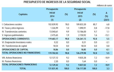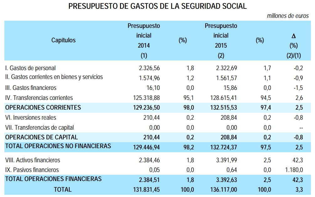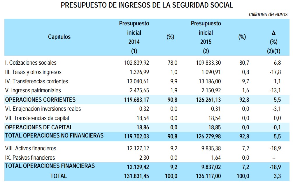 De hecho, para plantearse la sostenibilidad financiera del sistema no hay más que mirar a las tablas principales de los Presupuestos oficiales de la Seguridad Social. En 2015, si se cumplen las previsiones del Ministerio (que ya hemos visto que no se han cumplido desde que comenzó la crisis) las transferencias corrientes ascenderán a 128.615 millones de euros y los ingresos por cotizaciones se quedarán por debajo de los 110.000 millones. El agujero habrá que cubrirlo vía impuestos o con el Fondo de Reserva. En este sentido, es significativo que hayan aumentado las transferencias desde el Gobierno hacia la Seguridad Social (por complementos a mínimos y pensiones no contributivas). Ante los números rojos del sistema, se han pasado partidas al Presupuesto General que antes se pagaban vía cotizaciones.