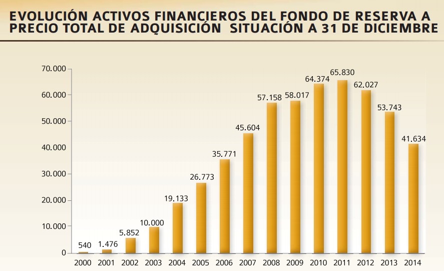 Eso sí, estas buenas noticias lanzan, una vez más, una señal de alarma sobre la sostenibilidad del sistema. Hace unos días conocíamos que el Fondo de Reserva de la Seguridad Social tuvo que poner 15.000 millones de euros a lo largo de 2014 para poder pagar las pensiones. Tras este gasto, la famosa hucha de las pensiones se queda con 41.634 millones de euros a cierre del ejercicio (aunque la cifra sube a casi 48.000 si lo valoramos a precios de mercado) cuando en 2011 superaba los 68.000 millones. De nuevo, las previsiones oficiales no se cumplen. En los Presupuestos Generales para 2014 se había previsto sacar 11.000 millones de euros, una cifra que se quedó muy corta.