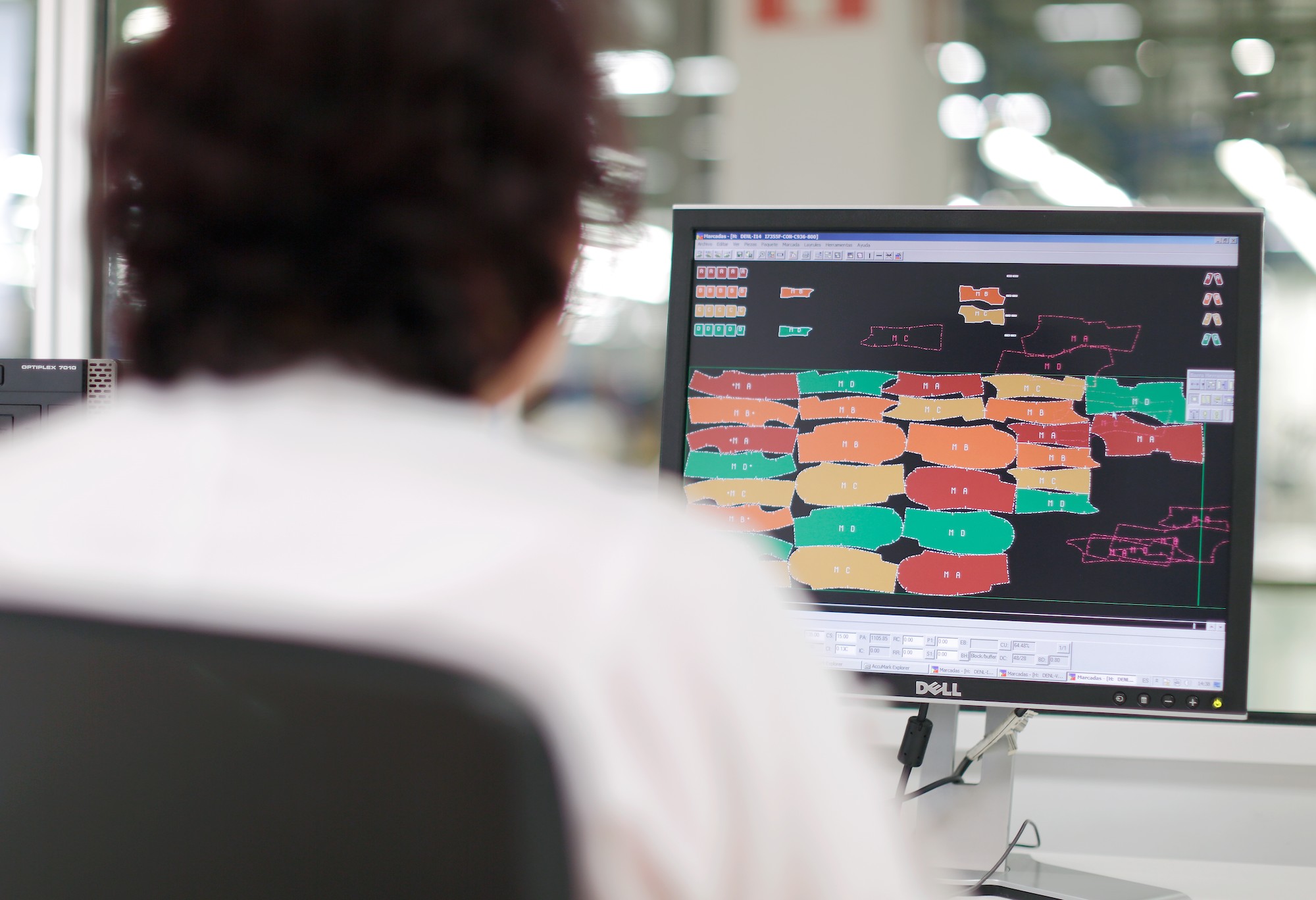 Cuando las telas llegan a la fábrica, los patronistas utilizan un programa informático para acoplar los patrones digitalizados en los tejidos como si fuera un Tetris