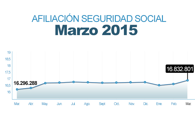 Por otro lado, el volumen medio de afiliados a la Seguridad Social aumentó en 160.579 personas (0,96%), también la mejor cifra en un mes de marzo de la serie histórica, hasta situarse en un total de 16.832.801 ocupados. Desde que comenzó la crisis, se han creado de media un total de 44.088 empleos en los meses de marzo.