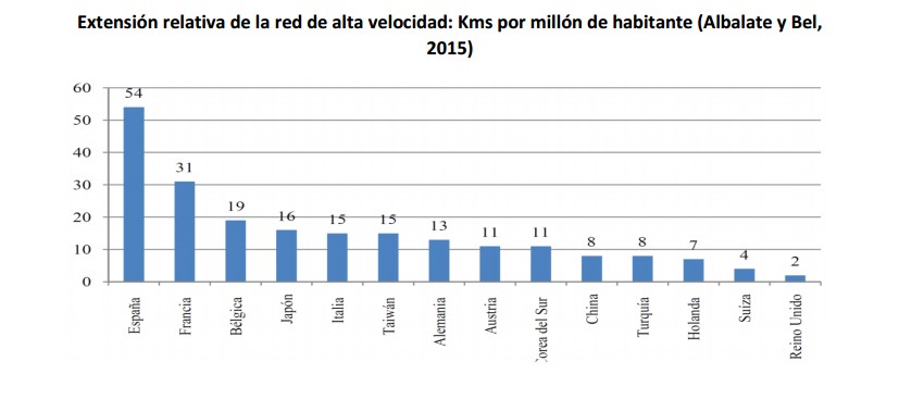 4. ¿Hasta dónde?: Desde que comenzó la polémica, en Ciudadanos intentaron calmar los ánimos asegurando que todas las líneas en construcción y licitadas se acabarían. Su propuesta es no hacer nuevas líneas. Su planteamiento es que ya tenemos suficiente. Para apoyar su argumentación, utilizan las dos siguientes tablas: España es el país con más kilómetros de AVE por habitante (cuando se terminen todas las obras previstas tendrá 79 kilómetros por millón de habitantes, casi el doble que el segundo, Francia, con 43) y el que menos usuarios registra por kilómetro recorrido.